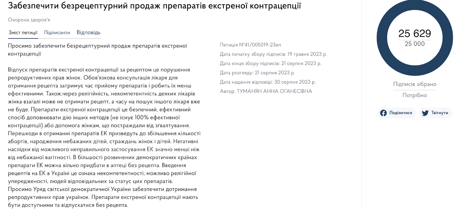 - На сайті Кабміну набрала потрібну кількість голосів петиція про виключення екстреної контрацепції зі списку рецептурних препаратів. Вона вже отримала відповідь уряду.