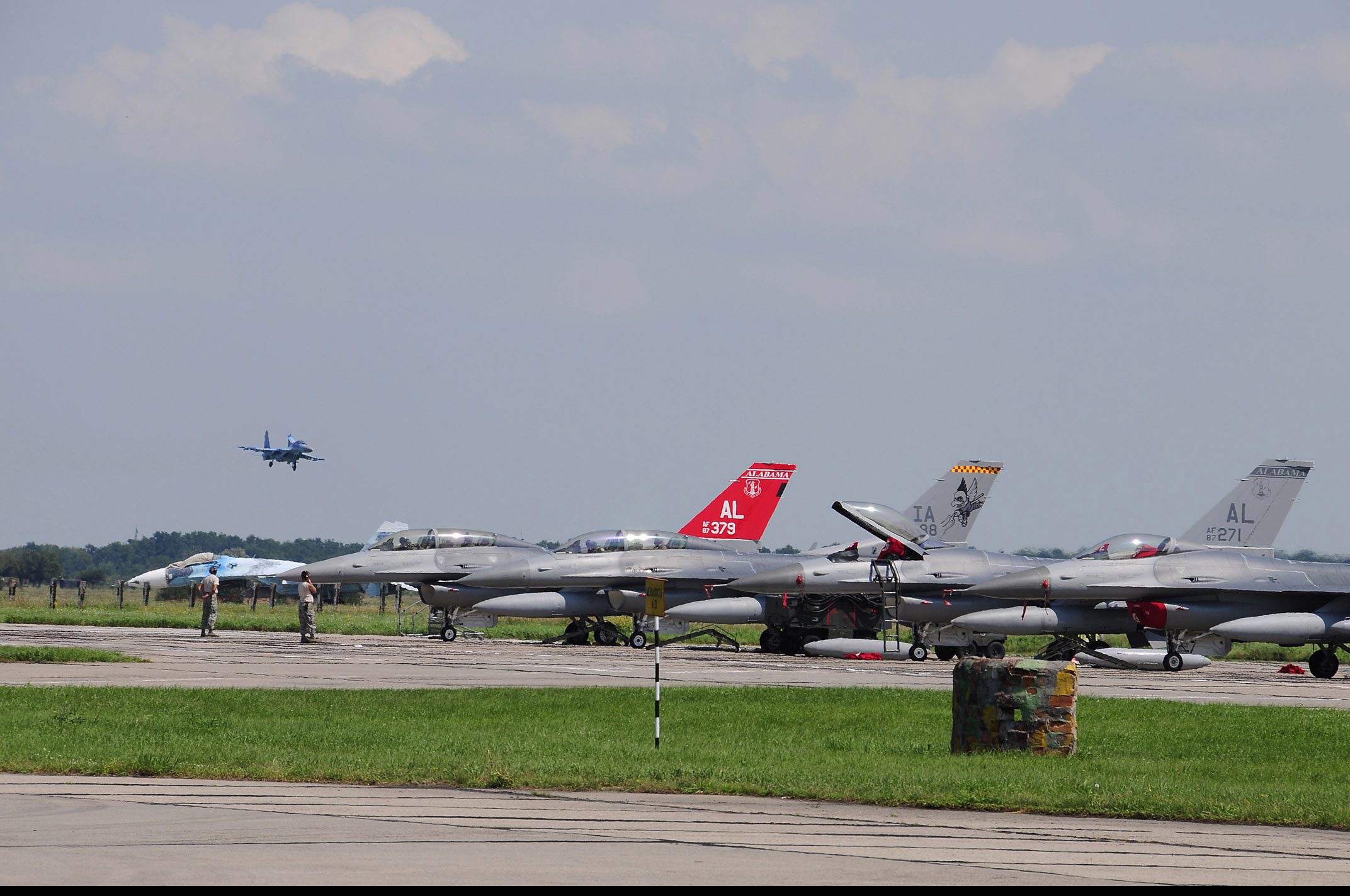 Літак F-16D ВПС США на лінії польоту авіабази у Миргороді 28 липня 2011 року під час міжнародних навчань Safe Skies 2011. Фото: Charles Vaughn / Wikimedia